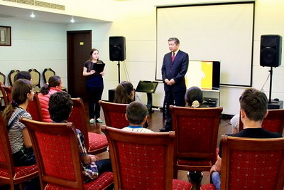 岳大使首先致辞,欢迎学生们从什达-卡尔特里州来中国使馆做客,并向他们致以国际儿童节的问候。他简要介绍了中国的历史、文化、发展等基本情况,回顾了中格两国人民悠远的交往历史,以及在共建“丝绸之路经济带”东风的推动下,两国各领域合作取得的快速发展,希望同学们能学习汉语,有机会到中国走一走、看一看,实地了解中华历史文化和当代发展,争做中格友好事业的接班人。