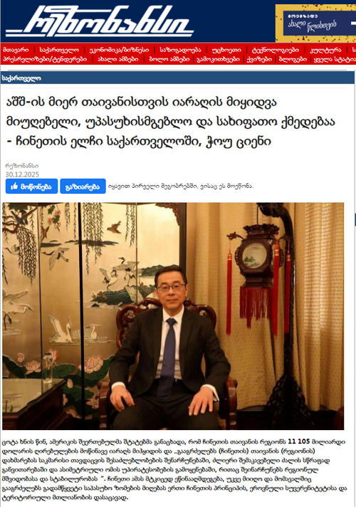 2025年12月30日,驻格鲁吉亚大使周谦在格发行量最大的报纸之一《回声报》官网发表题为《美国对中国台湾地区军售是不可接受、不负责任的危险行为》署名文章,该报将在2026年新年首期纸质版报刊对文章进行刊载。全文如下:
