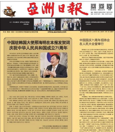 2020年10月5日,驻韩国大使邢海明在韩国《亚洲日报》中国国庆特刊发表贺词,介绍中华人民共和国成立71年来,中国共产党领导中国人民取得的辉煌成就,强调中方愿同世界各国一道,坚持和弘扬多边主义,共同构建人类命运共同体。中方期待同韩方继续携手并肩,进一步深化互利合作,共同开创更加美好的明天。全文如下: