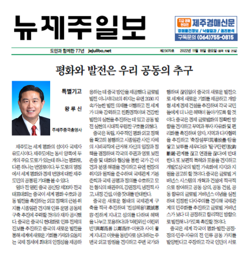 2022年11月18日,驻济州总领事王鲁新在韩国《新济州日报》发表署名文章《和平与发展是人心所向》,阐释习近平主席提出的全球安全倡议和全球发展倡议,以及中国将始终坚持维护世界和平、促进共同发展的外交政策宗旨,致力于推动构建人类命运共同体。强调中国将以中国式现代化推动人类整体进步,以中国的新发展为世界带来新机遇,为动荡不安的国际形势提供最大稳定性,为国际社会应对全球性挑战提供强大正能量。全文如下: