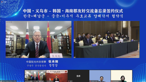 2022年11月24日,驻光州总领事张承刚应邀出席浙江省义乌市同全罗南道海南郡友好交流备忘录线上签署仪式并致辞。义乌市市长叶帮锐、副市长王炜、浙江省友协副会长邢绘东以及海南郡守明炫官、韩中经济文化教育协会理事长申京淑、会长林洪根等参加。