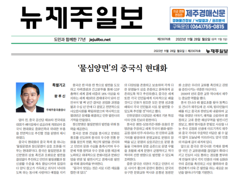 2022年11月28日,驻济州总领事王鲁新在领区主要媒体《新济州日报》发表署名文章《“两个文明”协调发展的中国式现代化》,阐释物质文明与精神文明相协调的中国式现代化,指出中国将不断推动物质文明与精神文明相互促进、协调发展,不断丰富人民物质生活和精神生活,主张世界各国弘扬和平、发展、公平、正义、民主、自由的全人类共同价值,以文明交流超越文明隔阂,以文明互鉴超越文明冲突,以文明共存超越文明优越。中国愿同韩国社会各界一道,不断扩大两国民间交流往来,丰富民心相通渠道,推动两国各地民众进一步深化了解、增进友谊,携手开创中韩关系更大发展新的三十年。全文如下: