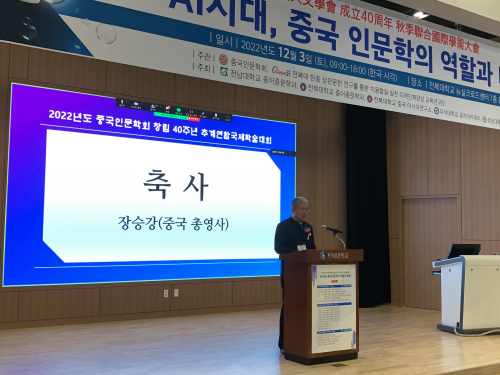 2022年12月3日,驻光州总领事张承刚受邀出席韩国中国人文学会2022年秋季联合国际学术大会并致辞。全北大学副校长崔柏烈、韩国中国人文学会会长陈明镐以及来自中国、韩国、日本及越南等多国专家学者以线上线下方式参加。