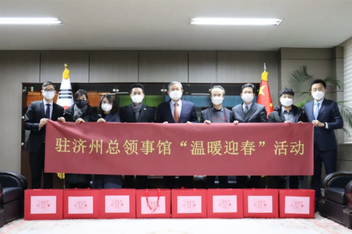 当天下午,受王鲁新总领事委托,总领馆工作人员专程赴济州大学,慰问在济留学生并送上“温暖迎春包”。