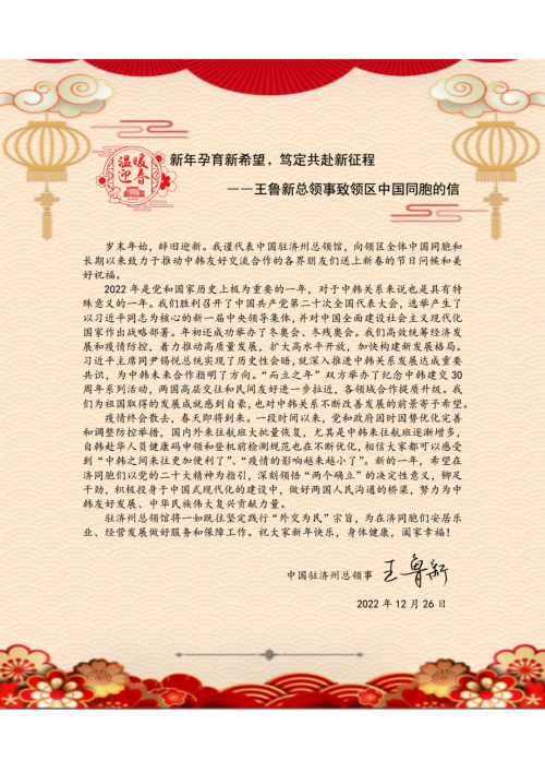 王总领事首先代表总领馆全体人员向领区侨胞和留学生致以节日祝福和问候,表示2022年是党和国家历史上极为重要的一年,我们胜利召开党的二十大,描绘了全面建设社会主义现代化国家的宏伟蓝图。党和政府时刻牵挂着海外同胞的生命安全和身体健康,祖国永远在大家身边。总领馆将坚持“以人民为中心”的发展思想,把“外交为民”宗旨落到实处,始终关注关心领区同胞们工作学习生活情况,积极维护保障在济同胞安全和合法权益,做好大家的家里人、贴心人和守护人。王总领事充分肯定在济同胞长期以来在维护国家主权和民族尊严、建设和谐团结侨社、积极融入当地社会、促进中韩友好合作等方面所作贡献,鼓励在济同胞们再接再厉,在深化中韩双方务实合作、扩大人文交流等方面发挥积极作用。