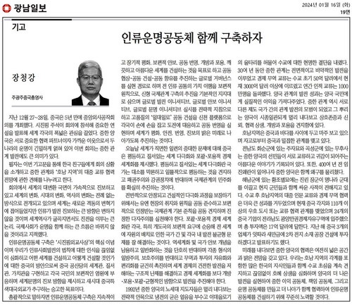 2024年1月16日,驻光州总领事张承刚在韩国《光南日报》发表署名文章《携手构建人类命运共同体》,介绍中央外事工作会议精神,指出构建人类命运共同体是习近平外交思想的核心理念,是新时代中国特色大国外交追求的崇高目标;总结中韩关系及领区对华交流合作成果,指出中韩两国要努力打造利益共同体、责任共同体和命运共同体,并为构建人类命运共同体而携手奋斗。全文如下: