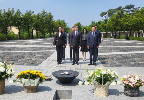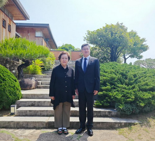2024年5月21日,驻釜山总领事陈日彪前往韩国前总统卢武铉故居,探望其遗孀权良淑女士。