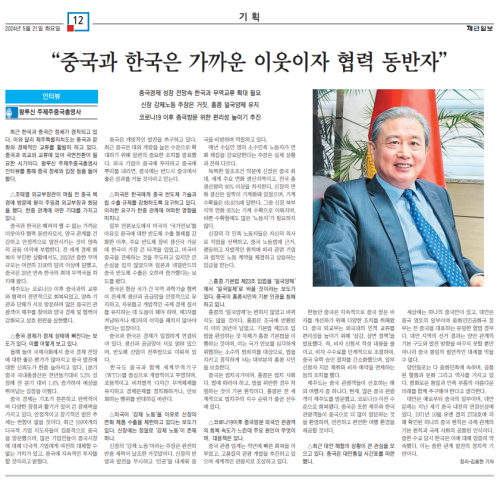 2024年5月21日,领区主要媒体《济民日报》在纸媒和网站刊登对驻济州总领事王鲁新的专访《中韩是重要近邻与合作伙伴》。王总领事就中韩关系与两国经贸合作、中国经济发展前景、赴华旅游便利化、台湾问题及涉港、涉疆等问题回答了有关提问,阐明了中方原则立场,希望中韩两国坚守建交初心,坚持睦邻友好,加强互利合作,携手推动中韩关系持续健康稳定发展。全文如下: