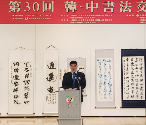 2024年6月7日,驻光州总领事顾景奇应邀出席由国际书法艺术联合韩国本部湖南支会同中国北京尚艺文化艺术发展中心共同举办的“第30届韩中书法交流展”并致辞,来自中韩两国的书法家及爱好者等100余人参加。