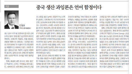 2024年6月28日,驻釜山总领事陈日彪在釜山主要报纸《国际新闻》发表署名文章《“中国产能过剩论”是语言陷阱》,通过详列事实数据,说明中国向世界提供的是符合全球可持续发展需要的优质产能、稀缺产能,中国新能源产业为全球减排作出巨大贡献,批驳所谓“中国产能过剩论”不符合经济常识和客观事实,实际是美西方国家对中国新能源产品采取贸易保护主义措施的托词,强调中国愿继续秉持开放合作、互利共赢理念,同包括韩国在内的世界各国一道,进一步挖掘新能源等领域合作潜力,为应对全球气候变化和推动绿色低碳发展作出更多贡献。