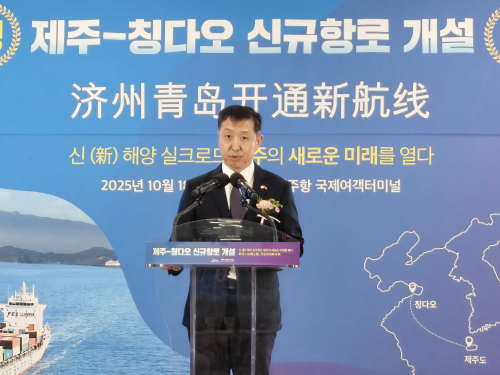 2025年10月18日,驻济州总领事陈建军应邀出席“济州—青岛新航线开通”庆祝活动,济州道知事吴怜勋、道议会议长李祥奉、济州海洋警察厅长朴相春、山东远洋海运集团有限公司董事长赵博、济州经营者总协会会长韩奉心等各界嘉宾及道民群众500余人参加。