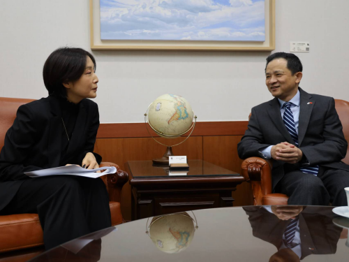 2025年11月25日,驻韩国大使戴兵会见韩国外交部新任次官补郑义慧。戴兵大使祝贺郑义慧履新。双方就中韩关系深入交换意见,一致认为习近平主席访韩取得圆满成功,要落实好两国元首重要共识,加强双方各领域交流合作,推动中韩战略合作伙伴关系乘势而上、行稳致远,更好造福两国人民。