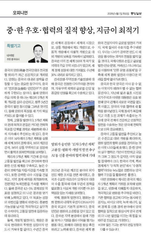 2026年4月7日,驻韩国大使戴兵在韩国《中央日报》发表题为《中韩友好合作提质升级正当其时》的署名文章,以高质量发展、开放发展、和平发展三个关键词阐释中国“十五五”愿景,强调当前形势下维护中韩关系健康稳定发展对双方的战略重要性,呼吁韩国各界抓住中国“十五五”机遇,推动中韩友好合作提质升级。全文如下: