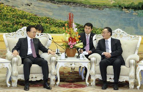 2012年1月9日,全国人大常委会委员长吴邦国在人民大会堂会见了韩国总统李明博。