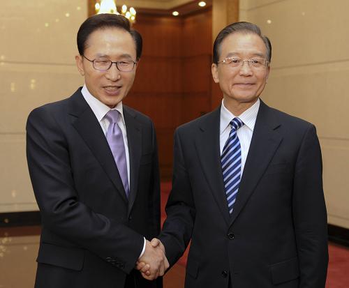2012年1月10日,国务院总理温家宝在钓鱼台国宾馆会见韩国总统李明博。