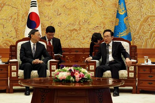 当地时间3月2日,韩国总统李明博在首尔会见了正在韩国访问的中国外交部长杨洁篪。
