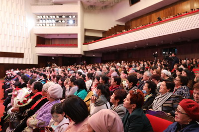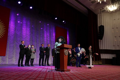 吉妇女大会主席阿克巴吉舍娃代表吉全国妇女向杜大使致以节日祝贺,现场观众报以热烈掌声表达祝福。