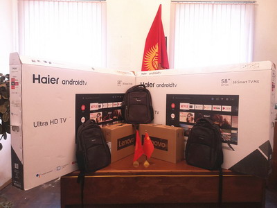 上合组织睦委会本次向巴特肯州二所小学共援助2台智能电视机、4台笔记本电脑和100个书包。