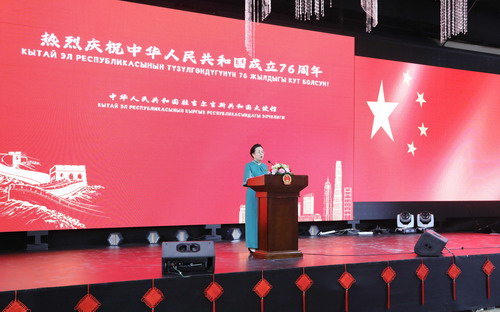 刘江平大使在致辞中全面展现新中国成立76年取得的辉煌发展成就以及对世界和平、稳定、繁荣作出的重要贡献,介绍上合组织天津峰会和“九·三”纪念活动丰硕成果,阐释全球治理倡议深刻内涵。刘大使高度评价中吉关系发展成果,表示双方将携手构建人类命运共同体,造福两国和全世界人民。