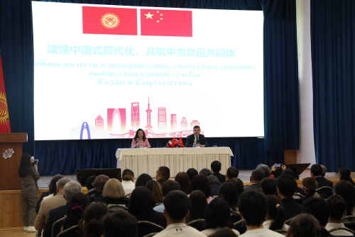 刘大使结合2026年全国两会情况,深刻阐释中国式现代化的丰富内涵,生动宣介“十四五”时期发展成就。刘大使指出,今年是中国“十五五”开局之年,“十五五”规划纲要不仅为中国描绘了一份幸福蓝图,也为包括吉在内的世界各国带来新机遇。当前两国关系发展步入“黄金期”,各领域合作蓬勃发展。希望同学们抓住机遇,努力学习,为构建中吉命运共同体贡献力量。