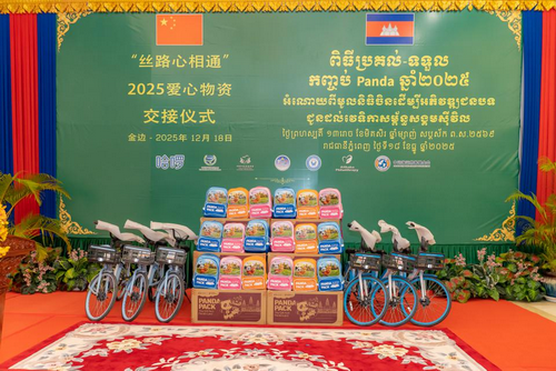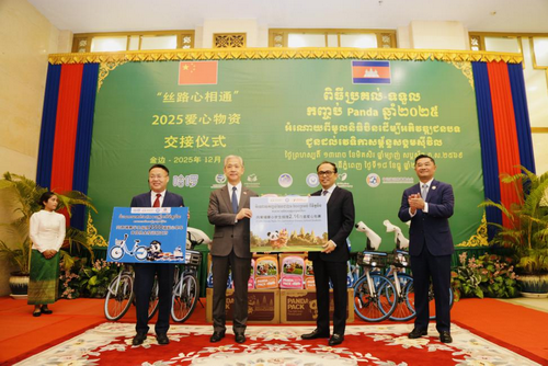 2025年12月18日,中国乡村发展基金会同柬埔寨民间社会组织联盟论坛在金边举行“丝路心相通”爱心物资交接仪式。柬埔寨副首相兼内阁办公厅大臣翁赛维索、驻柬埔寨大使汪文斌出席并致辞,柬政府、非政府组织、学校师生代表共百余人参加。