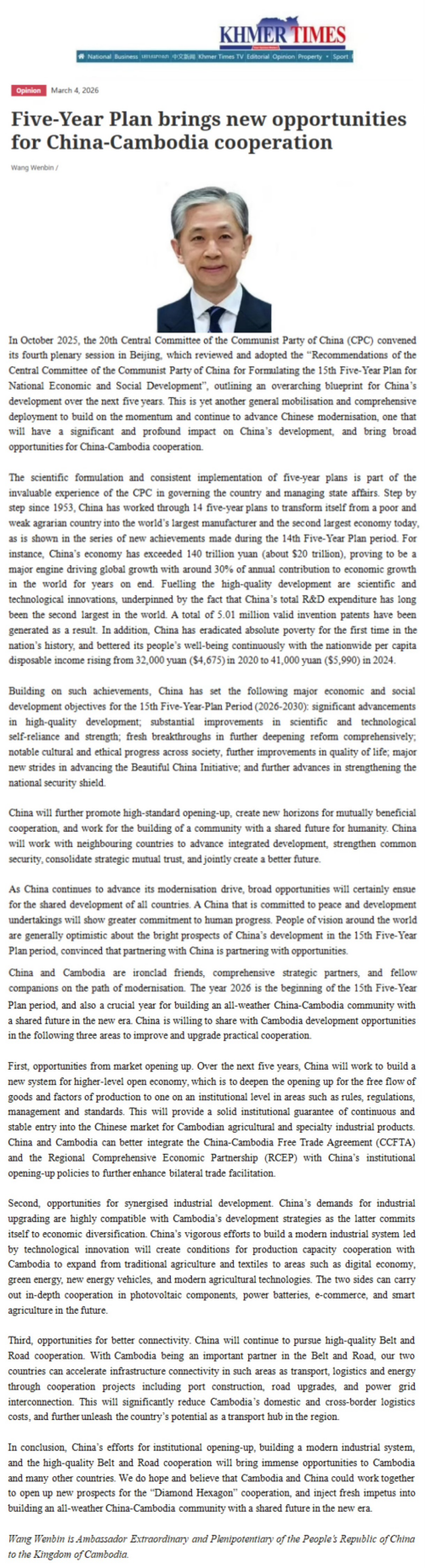 2026年3月4日,驻柬埔寨大使汪文斌在柬主流媒体《高棉时报》、酸角树网站和《柬华日报》发表署名文章《“十五五”规划为中柬合作带来新机遇》。
