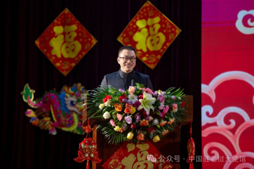 王畅临时代办致辞回顾2023年中国高质量发展成就、中国特色大国外交亮点和中老合作成果,指出中国经济稳固坚韧,新质生产力加快形成,稳居全球发展最大贡献者。点赞旅老侨胞所作积极贡献,勉励大家秉持龙的精神攻坚克难、勇往直前,继续投身祖国发展和统一大业,助力构建中老命运共同体。使馆将全力践行“外交为民”理念做好服务。