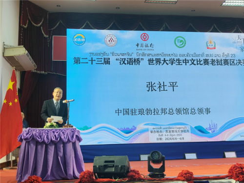 2024年6月7日,驻琅勃拉邦总领事张社平出席第23届“汉语桥”世界大学生中文比赛老挝赛区决赛,这是该赛事首次在琅勃拉邦举行。各界人士600余人观赛。