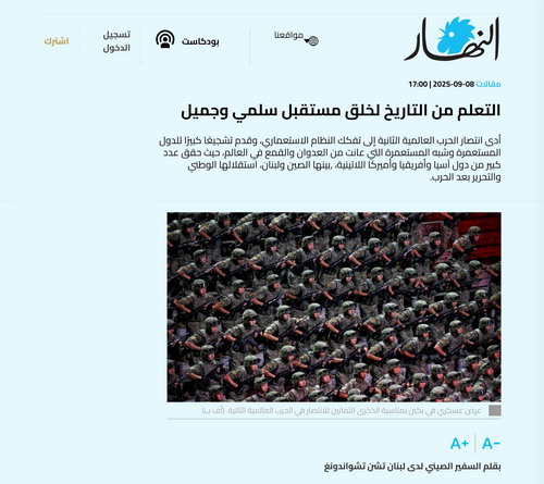 2025年9月8日,驻黎巴嫩大使陈传东就纪念中国人民抗日战争暨世界反法西斯战争胜利80周年在黎主要媒体《白天报》发表署名文章《以史为鉴 开创和平美好未来》,全文如下: