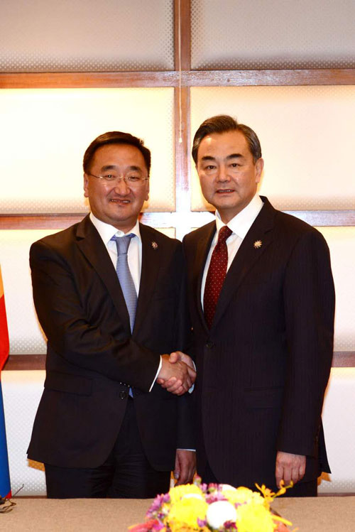 王毅表示,中蒙全面战略伙伴关系发展总体顺利。中方愿与蒙方保持中蒙关系良好发展势头,积极推进丝绸之路经济带和草原之路倡议的战略对接,加快中蒙俄经济走廊建设,推进大项目合作。今年是世界反法西斯战争和中国人民抗日战争胜利70周年,这是中国人民、亚洲各国人民和全世界爱好和平人民的胜利,中国愿同包括蒙古在内的国家共同纪念。