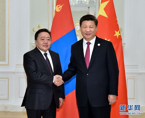 习近平指出,当前,中蒙关系发展势头良好,双方保持密切交往,务实合作不断深化。双方应共同努力,加紧落实已达成的各项重要共识,充实中蒙全面战略伙伴关系内涵,推动两国关系迈上新的更高水平。两国要加强各层级交往,夯实互信基础,在涉及各自核心利益和重大关切问题上相互理解、相互支持。要加快推进丝绸之路经济带同“草原之路”倡议战略对接,拓展务实合作,努力实现双边贸易额2020年达到100亿美元的目标。积极推动两国大项目合作取得实质性进展,在过境运输等项目上加强合作。中方愿同蒙方加强在上海合作组织等地区多边机制内合作,愿同蒙方、俄方共同推进中蒙俄合作,支持蒙方下个月举办第十一届亚欧首脑会议。
