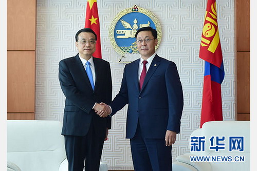 李克强指出,中蒙经济互补性强,进一步深化两国合作面临新的机遇。中方愿做好“丝绸之路经济带”倡议同蒙方“草原之路”发展战略对接,尽早启动双边自贸协定联合可行性研究。在农畜产品深加工、住房和基础设施建设等领域打造合作新亮点,取得新突破。加强金融合作,扩大本币互换规模。密切人文交流,增进两国人民的理解和友谊。