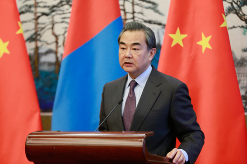 2017年2月20日,外交部长王毅在北京与蒙古外长蒙赫奥尔吉勒会谈后共同会见记者。