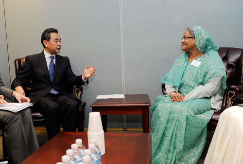 2013年9月24日,外交部长王毅在纽约联合国总部会见孟加拉国总理哈西娜。