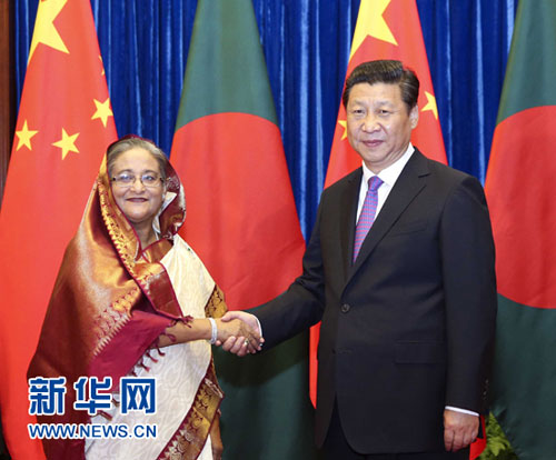 习近平表示,2010年6月,我访问了孟加拉国,当时双方达成的各项合作项目都得到了落实,我感到高兴。你这次访华期间,双方在经贸、能源、防灾减灾、防务、海洋、人文等领域合作取得扎实进展。中方支持孟方走符合本国国情的发展道路,愿在农业等领域同孟方分享技术和经验,帮助孟方实现减贫和发展。孟加拉国是海上丝绸之路沿线重要国家。中方欢迎孟方积极参加建设丝绸之路经济带和21世纪海上丝绸之路合作倡议,同时推进孟中印缅经济走廊建设,打造利益共同体,造福两国和本地区人民。双方还要保持在重大问题上沟通和协调,加强维和、反恐等领域合作。