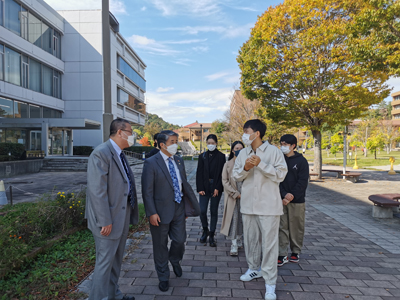 薛剑总领事一行首先来到广岛县唯一国立大学——广岛大学,在中国留学生代表和广岛大学北京研究中心主任本田义央教授陪同下参观校园。留学生们表示,平时经常在线参加总领馆举办的活动,同亲切的“薛叔”隔屏交流,但总领事亲自到广岛大学看望留学生尚属近年来首次,大家都感到非常激动和振奋。