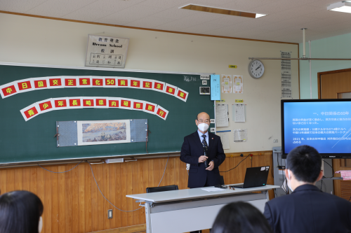 张总领事认真听取了同学们在中日邦交正常化50周年之际参观长崎市内与中国相关史迹的收获和感受汇报后,称赞同学们事前准备充分,自主学习能力强,汇报展示生动全面,掌握了许多长崎与中国友好交往的历史文化知识,由衷为大家感到高兴。张总领事在讲话中还概括了中日关系50年发展取得的丰硕成果,介绍了这50年长崎县对华交往主要情况以及总领馆职责。