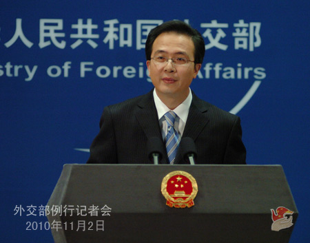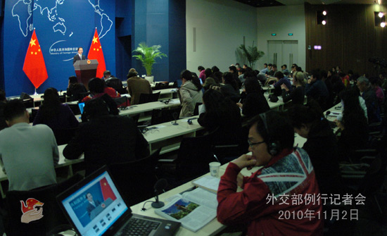 2010年11月2日,外交部发言人洪磊主持例行记者会。