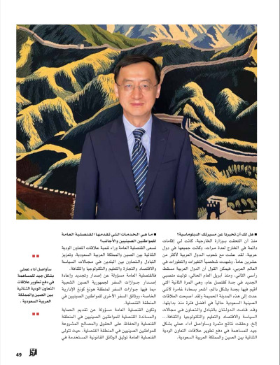 2023年12月19日,驻吉达总领事王奇敏接受沙特媒体《Arrajol世界》书面采访,就中沙双边关系、总领馆业务、领区发展等进行交流,全文如下: