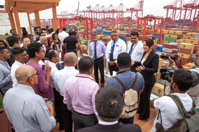 程大使一行随后赴科伦坡港南集装箱码头(CICT),在CICT楼顶参观了码头风貌,并听取了相关负责人对项目运营现状和本土化情况进行的介绍,在场人员都对CICT的经营业绩表示惊叹,也对公司在本土化方面取得的成就表示高度认可。在一楼文化墙,几名优秀当地员工还以亲身经历向来访人员介绍了公司的培训体系和激励机制,媒体记者们纷纷点头称赞。