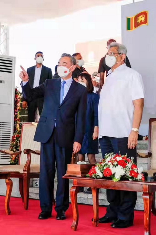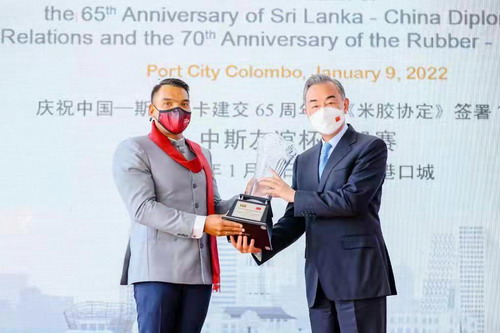 当地时间2022年1月9日,国务委员兼外长王毅在科伦坡同斯里兰卡总统戈塔巴雅、总理马欣达共同出席中斯建交65周年暨《米胶协定》签署70周年庆祝活动启动仪式。