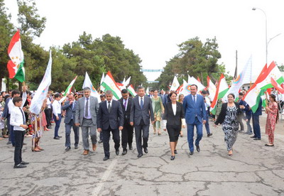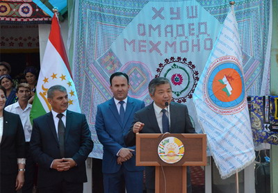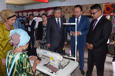 2018年5月16日,驻塔吉克斯坦大使岳斌赴塔哈特隆州古绍尼约恩区出席由使馆捐赠成立的妇女缝纫培训中心成立仪式。塔人民民主党副主席波波忠尼约恩、人民民主党哈特隆州主席拉赫蒙佐达、古绍尼约恩区区长贾法尔以及当地各界群众代表近千人参加。