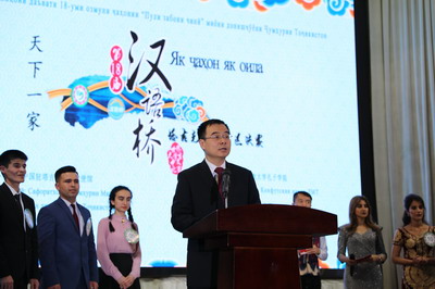 在师生们热烈的掌声中,刘彬大使发表了热情洋溢的演讲。刘大使指出,近年来,在中塔两国领导人亲自关心和大力推动下,两国全面战略伙伴关系快速发展,各领域合作蓬勃展开,“汉语热”在塔持续升温。在塔吉克斯坦有关部门和高校的大力支持下,汉语教学不断取得喜人成果。这是有利于两国友好合作持续发展和中塔友好事业后继有人的大好事。感谢所有在塔教师和志愿者为培养汉语人才、传播中国文化、服务中塔关系发展所付出的辛勤努力,同时预祝各位同学在今天的决赛中展示优秀表现,取得优异成绩。