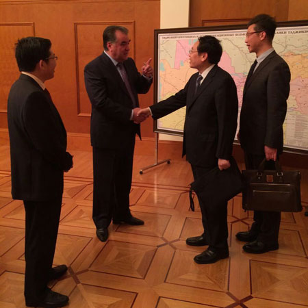 2015年5月28日,外交部副部长程国平率联合工作组赴塔吉克斯坦考察。在塔期间,程国平同塔吉克斯坦总统拉赫蒙举行会见,并同塔外交部、国防部、国安委负责人举行会谈。双方就落实两国元首共识,全面推进中塔合作充分交换意见,商定加强两国安全和防务合作,共同应对地区安全威胁和挑战。