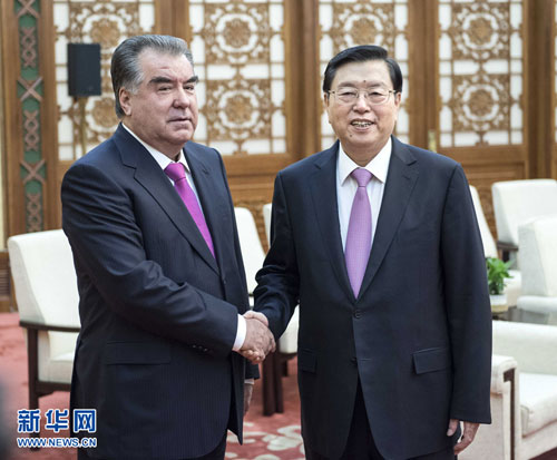 2017年8月31日,全国人大常委会委员长张德江在人民大会堂会见了塔吉克斯坦总统拉赫蒙。