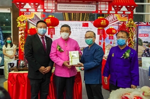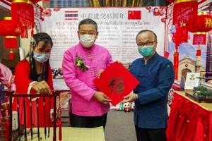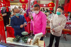 开幕式后,驻清迈总领事吴志武陪同乍伦力等参观了以庆祝中泰建交45周年为主题的中国展位。大家兴致勃勃地观看了反映中国和泰北各领域交流与合作、共同携手抗击新冠肺炎疫情等图片,欣赏了舞狮、古筝和茶艺表演,体验了毛笔书法。吴志武还向乍伦力赠送了《习近平谈治国理政》第三卷中、英文版。