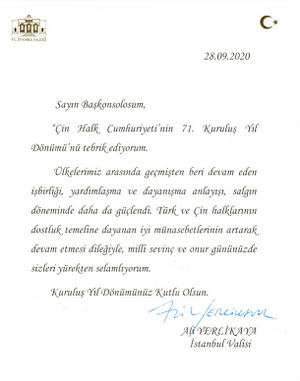 伊斯坦布尔省长耶尔利卡亚、市长伊曼姆奥卢分别向招待会发来贺信和视频,祝贺中华人民共和国成立71周年,高度赞赏中方抗疫成果、经济社会发展成就和中土合作进展,表示省、市政府将继续加强同中方交往,为两国友好关系发展做出更大贡献。