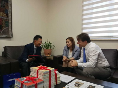 孙大使向国际学校赠送了一批中国图书,包括“中外文化交流故事”、“趣味中国文化”、“人文中国”、“中国儿童文学名著精选”、“中国古典文学趣读”、“中国经典名著故事”、“中国文化经典导读”及“中国智慧”等多个系列丛书,希望通过这些图书为在校各国学生了解中国、认识中国打开一个窗口。多赫提表示,这是学校收藏的关于中国的首批图书,将选取其中部分图书作为教学内容。