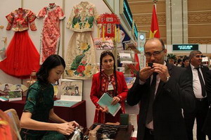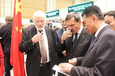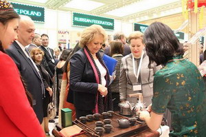 梅列多夫副总理兼外长特地参观中国展台,与驻土库曼斯坦大使孙炜东亲切交谈,饶有兴趣地观看茶艺表演,品尝世界闻名的西湖龙井,对中国发展成就和中国文化赞赏不已。