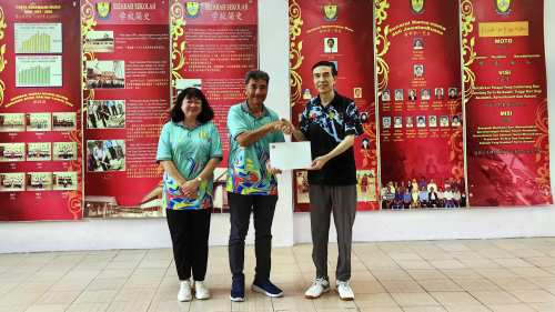 2025年9月13日,驻文莱大使肖建国应邀走访九汀中华学校,与学校董事长杨文成、校长陶美华等师生举行座谈,并向该校捐赠助学金。